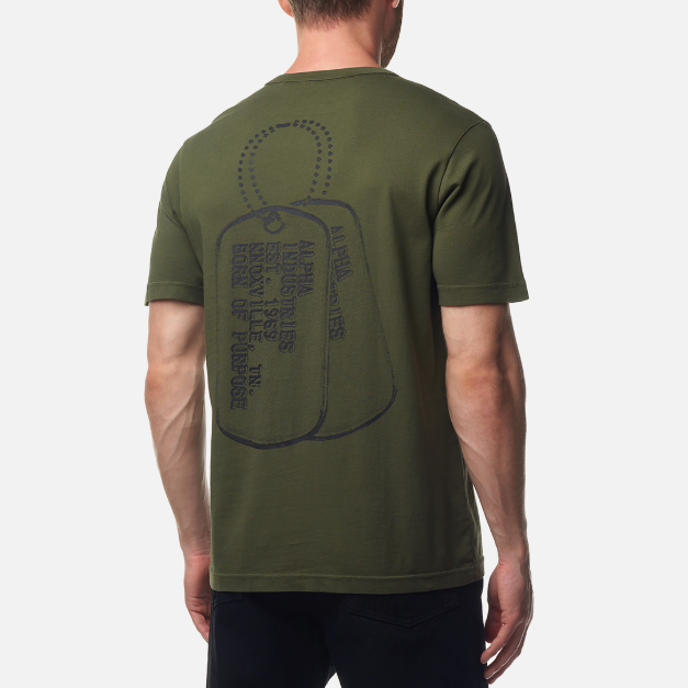 Футболка Alpha Industries Alpha Alpha Dog Tag Tee - повседневная футболка свободного кроя с принтами в стиле милитари на груди и на спине.  Футболка выполнена из 100% хлопка, приятна на ощупь и практична в использовании.